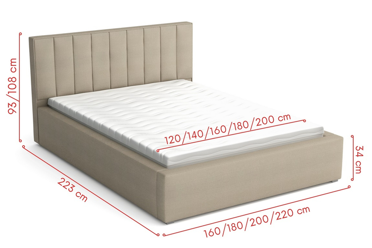 Elegantní postel s vysokým prošívaným čalouněným čelem. Nožky jsou plastové v šedé barvě. Rošt je v ceně, ale matrace je potřeba doobjednat. Vhodný rozměr matrace je 200 × 200 cm. Za příplatek je možné objednat postel s kovovým zvedacím roštem, tím vznikne pod ložnou plochou úložný prostor. Cena za postel s kovovým roštem na vyžádaní. Změnu roštu je nutné zadat při první objednávce. Výška bočnice od země je 34 cm, výška roštu od země je cca 24 cm. Dodáváme v demontovaném stavu.CASA 34008