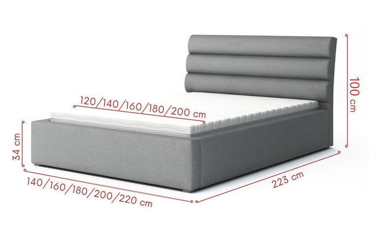 Elegantní postel s vysokým prošívaným čalouněným čelem. Nožky jsou plastové v šedé barvě. Rošt je v ceně, ale matrace je potřeba doobjednat. Vhodný rozměr matrace je 200 × 200 cm. Za příplatek je možné objednat postel s kovovým zvedacím roštem, tím vznikne pod ložnou plochou úložný prostor. Cena za postel s kovovým roštem na vyžádaní. Změnu roštu je nutné zadat při první objednávce. Výška bočnice od země je 34 cm, výška roštu od země je cca 24 cm. Dodáváme v demontovaném stavu.CASA 34007