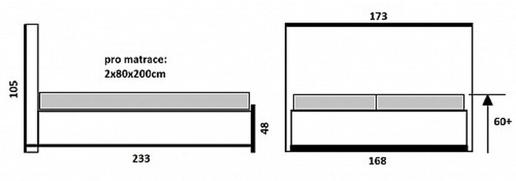 Celkové rozměry postele jsou: šířka 173 cm, hloubka 233 cm,