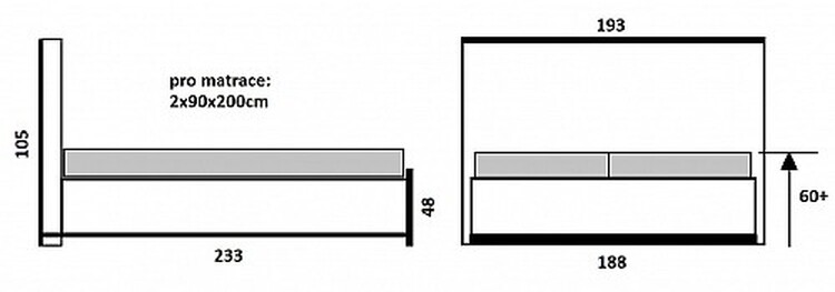 čela 105 cm. Konstrukce je určena pro dvě matrace o rozměru 90 ×