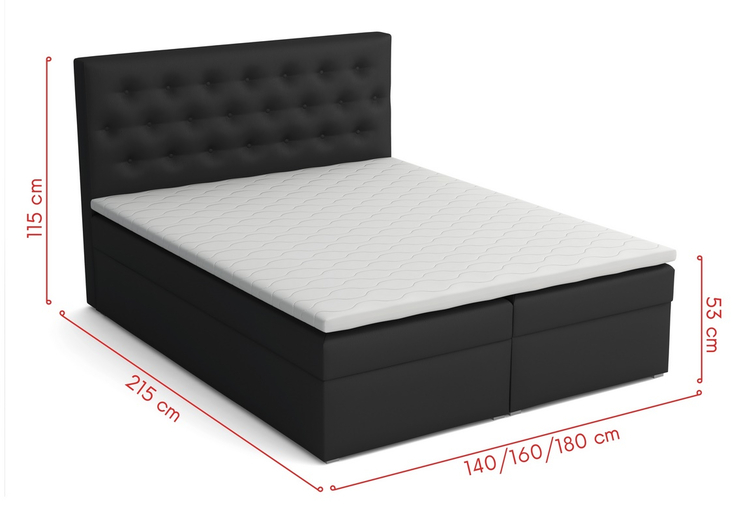Elegantní kontinentální postel moderního vzhledu s vysokým čelem s dekoračními knoflíky. Postel se dodává zároveň s matrací – boxspring styl. Pevná konstrukce postele je potažena ekokůží v barvě černé. Na ní se nachází vysoká bonelová matrace potažena stejnou ekokůží. Na ní je druhá tenká matrace v celku vyrobena z kvalitní hrubé PUR pěny tzv. topper (výška cca 5 cm). Ložní plocha činí 140 × 200 cm. Výška ložné plochy od země je cca 53 cm. Rozměry úložného prostoru – 2× (197×67×30 cm). Úložný prostor je k dispozici nadzvednutím matrace z boční strany postele.CASA 34015