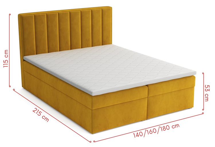Elegantní kontinentální postel moderního vzhledu s vysokým čelem s dekoračním prošíváním. Postel se dodává zároveň s matrací – boxspring styl. Pevná konstrukce postele je potažena látkou v barvě Bluvel 85. Na ní se nachází vysoká bonelová matrace potažena stejnou látkou. Na ní je druhá tenká matrace v celku vyrobena z kvalitní hrubé PUR pěny tzv. topper (výška cca 5 cm). Ložní plocha činí 180 × 200 cm. Výška ložné plochy od země je cca 53 cm. Rozměry úložného prostoru – 2× (197×67×30 cm). Úložný prostor je k dispozici nadzvednutím matrace z boční strany postele.CASA 34020