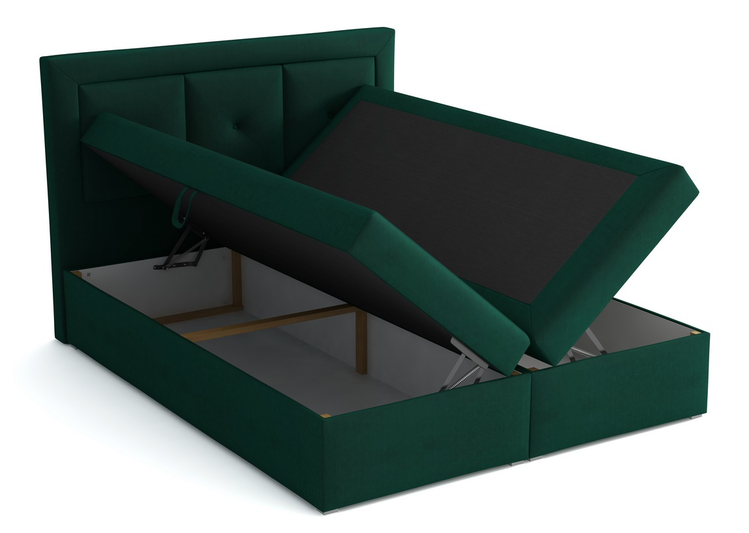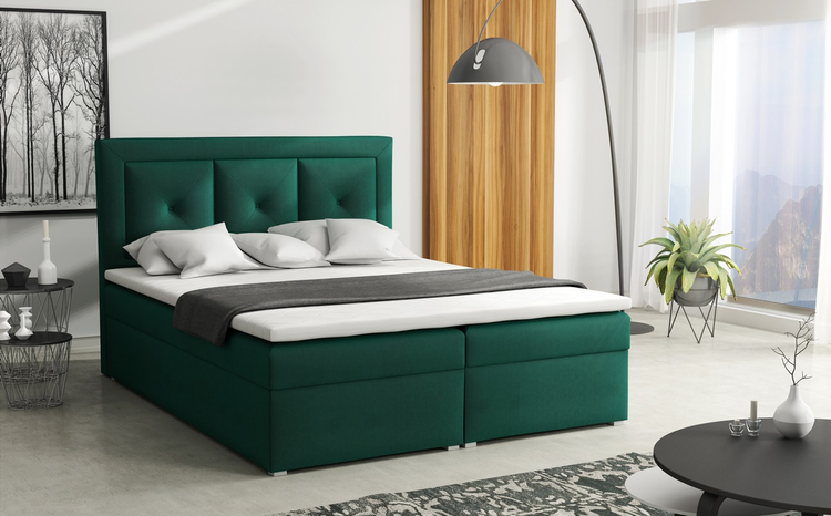 Elegantní kontinentální postel moderního vzhledu s vysokým čelem s dekoračním prošíváním a ozdobnými knoflíky. Postel se dodává zároveň s matrací – boxspring styl. Pevná konstrukce postele je potažena látkou v barvě světle šedé. Na ní se nachází vysoká bonelová matrace potažena stejnou látkou. Na ní je druhá tenká matrace v celku vyrobena z kvalitní hrubé PUR pěny tzv. topper (výška cca 5 cm). Ložní plocha činí 180 × 200 cm. Výška ložné plochy od země je cca 53 cm. Rozměry úložného prostoru – 2× (197×87×30 cm). Úložný prostor je k dispozici nadzvednutím matrace z boční strany postele.CASA 34011