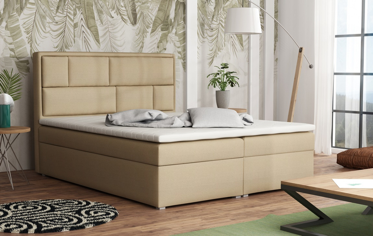 Elegantní kontinentální postel moderního vzhledu s vysokým čelem s dekoračním prošíváním. Postel se dodává zároveň s matrací – boxspring styl. Pevná konstrukce postele je potažena látkou v barvě béžové. Na ní se nachází vysoká bonelová matrace potažena stejnou látkou. Na ní je druhá tenká matrace v celku vyrobena z kvalitní hrubé PUR pěny tzv. topper (výška cca 5 cm). Ložní plocha činí 180 × 200 cm. Výška ložné plochy od země je cca 53 cm. Rozměry úložného prostoru – 2× (197×87×30 cm). Úložný prostor je k dispozici nadzvednutím matrace z boční strany postele.CASA 34013