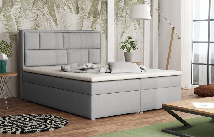 Elegantní kontinentální postel moderního vzhledu s vysokým čelem s dekoračním prošíváním. Postel se dodává zároveň s matrací – boxspring styl. Pevná konstrukce postele je potažena látkou v barvě světle šedé. Na ní se nachází vysoká bonelová matrace potažena stejnou látkou. Na ní je druhá tenká... více informací o zboží