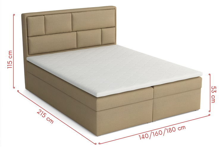 Elegantní kontinentální postel moderního vzhledu s vysokým čelem s dekoračním prošíváním. Postel se dodává zároveň s matrací – boxspring styl. Pevná konstrukce postele je potažena látkou v barvě světle šedé. Na ní se nachází vysoká bonelová matrace potažena stejnou látkou. Na ní je druhá tenká matrace v celku vyrobena z kvalitní hrubé PUR pěny tzv. topper (výška cca 5 cm). Ložní plocha činí 180 × 200 cm. Výška ložné plochy od země je cca 53 cm. Rozměry úložného prostoru – 2× (197×87×30 cm). Úložný prostor je k dispozici nadzvednutím matrace z boční strany postele.CASA 34013