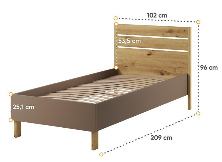Postel s roštem v ceně. Rozměry viz obrázek. Tento sektorový nábytek nejen pro teenagery působí nejen příjemně, ale má i svůj specifický charakter. Je vyroben z kvalitní LTD 16 mm hraněné ABS páskou. Jemné spojení lanýžového odstínu a dekoru v barvě dub artisan činí tuto kolekci nejen stylovou, ale také nadčasovou. Matraci je třeba dokoupit, vhodný rozměr je 90 × 200 cm. Doporučujeme i dokoupení béžového zahlavníku, který dodá větší komfort pro uživatele postele, naleznete v doporučených položkách. Dodáváme v demontovaném stavu.