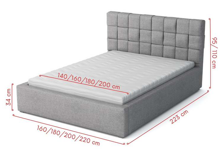 Elegantní postel s vysokým prošívaným čalouněným čelem. Nožky jsou plastové v šedé barvě. Rošt je v ceně, ale matrace je potřeba doobjednat. Vhodný rozměr matrace je 120 × 200 cm. Za příplatek je možné objednat postel s kovovým zvedacím roštem, tím vznikne pod ložnou plochou úložný prostor. Cena za postel s kovovým roštem na vyžádaní. Změnu roštu je nutné zadat při první objednávce. Výška bočnice od země je 34 cm, výška roštu od země je cca 24 cm. Dodáváme v demontovaném stavu.CASA 34005