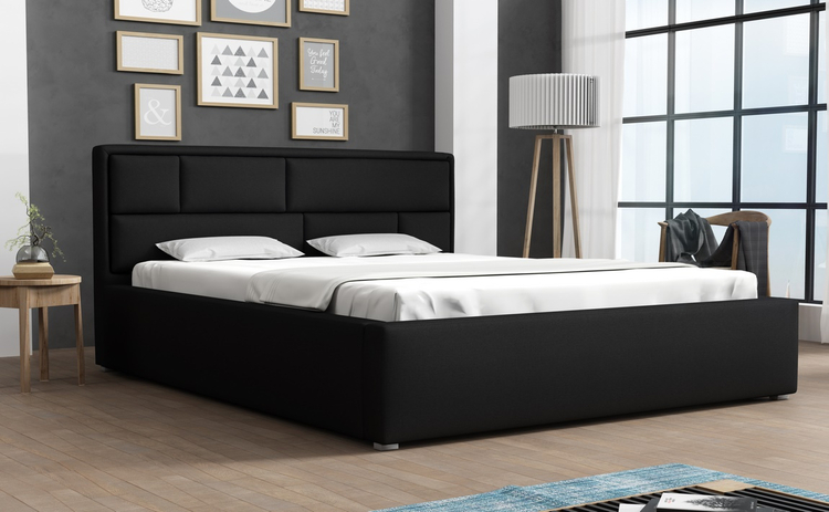 Elegantní postel s vysokým prošitým čalouněným čelem. Konstrukce je potažena látkou v černé barvě. Nožky jsou plastové v šedé barvě. Rošt je v ceně, ale matrace je potřeba doobjednat, vhodný rozměr 180 × 200 cm nebo 2 x matrace 90 × 200 cm. Za příplatek je možné objednat postel s kovovým zvedacím roštem, tím vznikne pod ložnou plochou úložný prostor. Cena za postel s kovovým roštem na vyžádaní. Změnu roštu je nutné zadat při první objednávce. Výška bočnice od země je 34 cm, výška roštu od země je cca 24 cm. Dodáváme v demontovaném stavu.CASA 34004