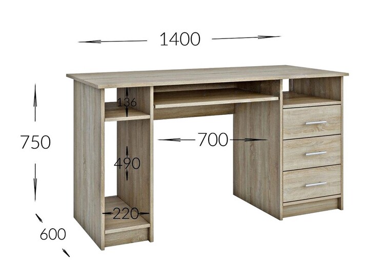 Pracovní sestava v praktickém provedení – sestava se skládá (šxvxh) – regál s dvířky a policemi ( 45 × 45 × 200 cm ) ),psací stůl se zásuvkami ( 140 × 60 × 75 cm ) a kontejner se 3 zásuvkami ( 50 × 45 × 64,5 cm ). Korpus i dvířka jsou z kvalitní LTD v barvě dub sonoma. Možnost koupení... více informací o zboží