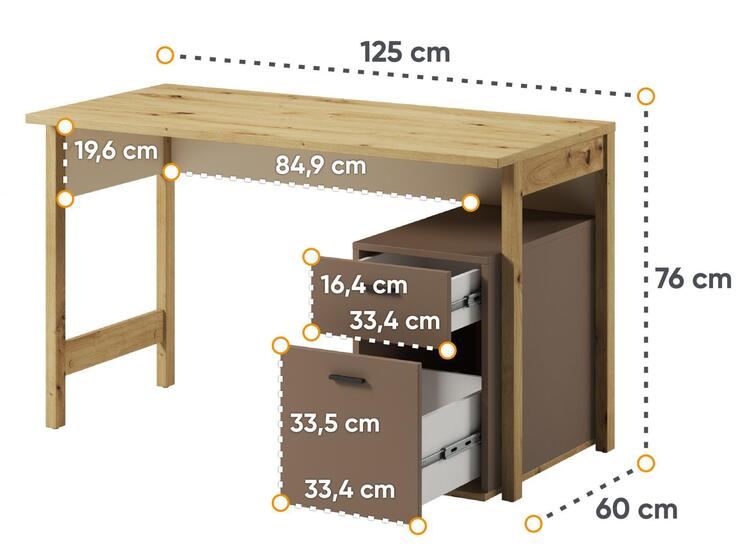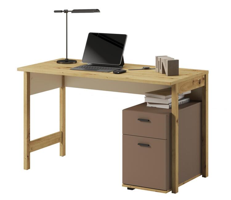 Pracovní stůl se dvěmi zásuvkami a volným prostorem. Rozměry viz obrázek. Tento sektorový nábytek nejen pro teenagery působí nejen příjemně, ale má i svůj specifický charakter. Je vyroben z kvalitní LTD 16 mm hraněné ABS páskou, zadní strany nábytku a dna zásuvek jsou z HDF 3 mm, ůchyty jsou z plastu. Jemné spojení pískového béžového, lanýžového odstínu a dekoru v barvě dub artisan činí tuto kolekci nejen stylovou, ale také nadčasovou. Dodáváme v demontovaném stavu.