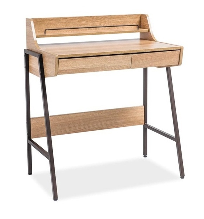 Jednoduchý pracovní stůl se dvěma zásuvkami. Konstrukce je kovová v tmavě hnědé barvě, deska je z kvalitní MDF v barvě dub. Součástí stolu je nástavec s poličkou. Vhodný i pro menší pokoje. Dodáváme v demontovaném stavu.CASA 11135