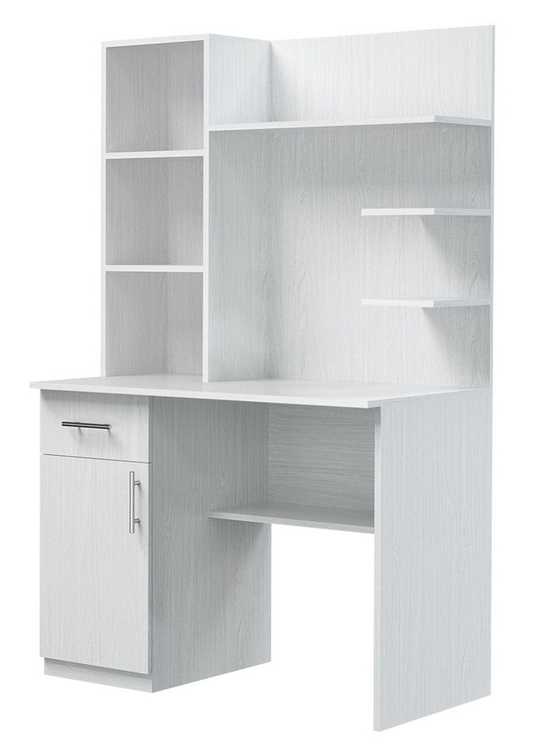 Praktický pracovní stůl s policovým nástavcem je vyroben z LTD desky odolné vůči poškrábání v barvě bílá strukturální. Stůl má na levé straně skříňku a nad ní zásuvku. Výška stolu včetně nástavce je 166,5 cm, hloubka nástavce je 30 cm. Výška pracovní plochy je 76,5 cm. Dodáváme v demontovaném stavu.CASA 19006