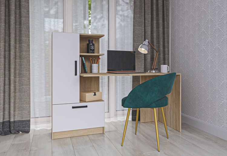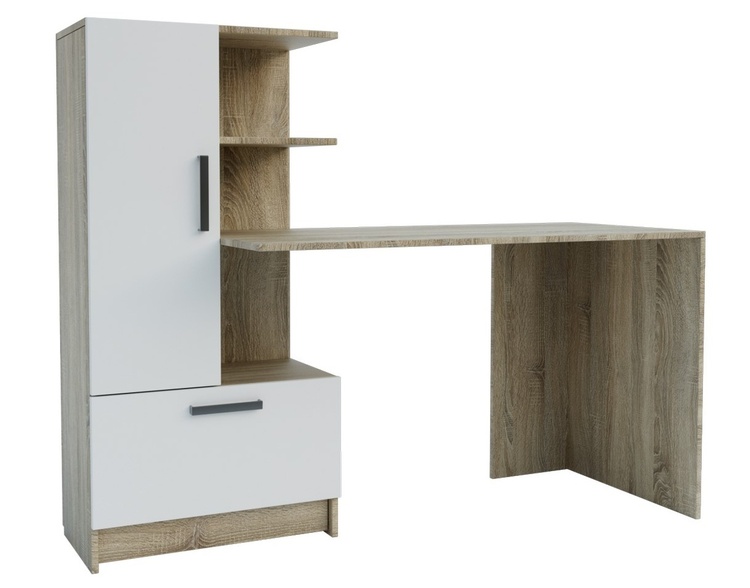 Praktický pracovní stůl levý. Pracovní stůl proveden v jednoduché linii, který se hodí do moderního interiéru. Je vyroben z LTD desky odolné vůči poškrábání v barvě dub sonoma v kombinaci s matnou bílou (nymphaea alba). Spodní skříňka je výklopná. Rozměry viz perokresba .Dodáváme v demontovaném stavu.CASA 83077