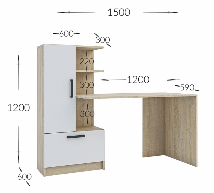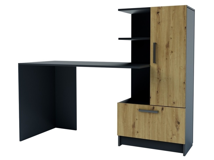 Praktický pracovní stůl pravý. Pracovní stůl proveden v jednoduché linii, který se hodí do moderního interiéru. Je vyroben z LTD desky odolné vůči poškrábání v barvě dub artisan v kombinaci s antracitem. Spodní skříňka je výklopná. Rozměry viz perokresba .Dodáváme v demontovaném stavu.