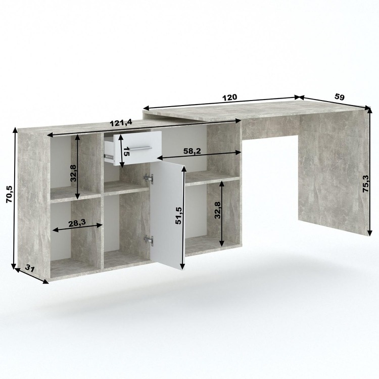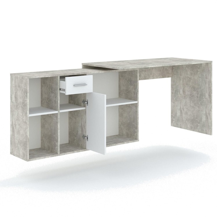 Pracovní stůl skládací nejen do rohu je vyroben z desky LTD v barevném provedení beton/bílá. Praktičnost stolu spočívá v jeho rozložení podle vašich představ. Obsahuje dvířka, zásuvku a spoustu úložného prostoru. Stůl je možné složit na pravou i levou stranu. Dodáváme v demontovaném stavu.CASA 85015