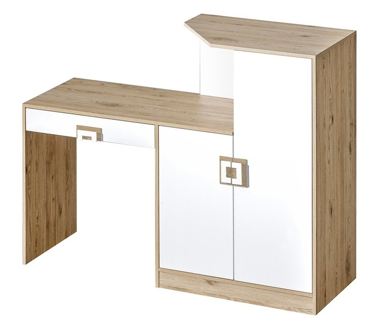Pracovní stůl s komodou NIKO ze sektorové řady, která se vyznačuje netradičním zpracováním barev a originalitou úchytů. Tento styl nábytku zaujme každou mladší generaci. Psací stůl je vyroben z kvalitní LTD desky hraněné ABS lištou. Korpus je v barvě dub jasný, dvířka jsou v barvě matná bílá.... více informací o zboží