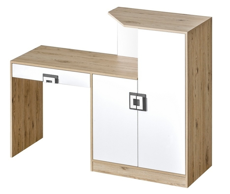 Pracovní stůl s komodou NIKO ze sektorové řady, která se vyznačuje netradičním zpracováním barev a originalitou úchytů. Tento styl nábytku zaujme každou mladší generaci. Psací stůl je vyroben z kvalitní LTD desky hraněné ABS lištou. Korpus je v barvě dub jasný, dvířka jsou v barvě matná bílá.... více informací o zboží