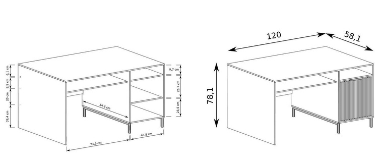 Nábytek je zdoben vzorem na čelních stranách v podobě frézovaných drážek. Všechny kusy nábytku z této kolekce stojí na černých kovových nožkách. Jednoduché a funkční tvary se hodí do obývacího pokoje, ložnice i jídelny.