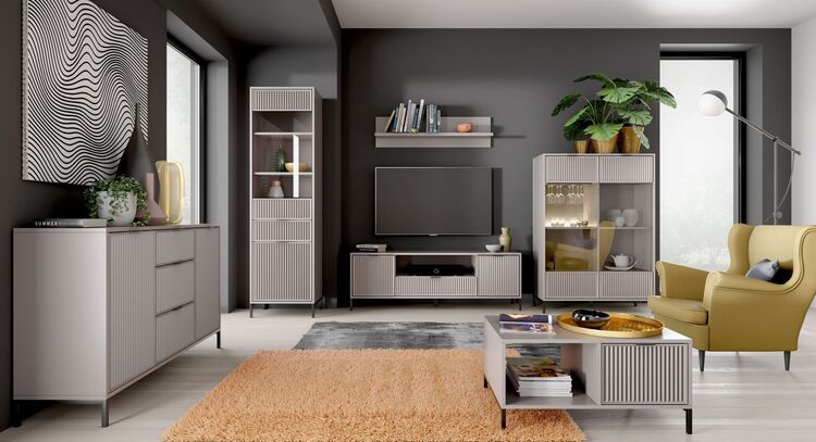 Nábytek je zdoben vzorem na čelních stranách v podobě frézovaných drážek. Všechny kusy nábytku z této kolekce stojí na černých kovových nožkách. Jednoduché a funkční tvary se hodí do obývacího pokoje, ložnice i jídelny.