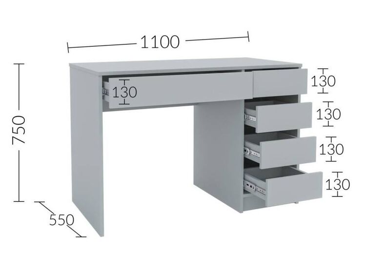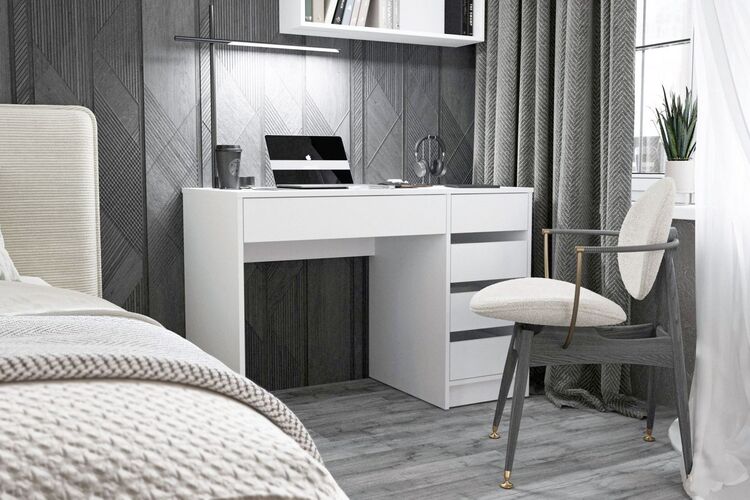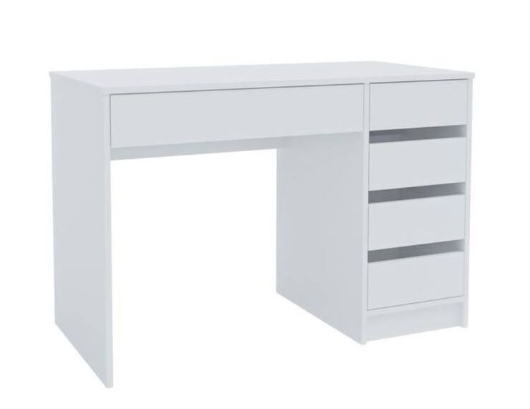 Elegantní pracovní stůl. Je mimořádně praktický díky pěti zásuvkám na teleskopických kolejnicích. je vyrobený z kvalitní laminátové desky v barevném provedení matná bílá (nymphea alba). Jde o pravou variantu, lze zakoupit i opačnou verzi. Dodáváme v demontovaném stavu.CASA 83182