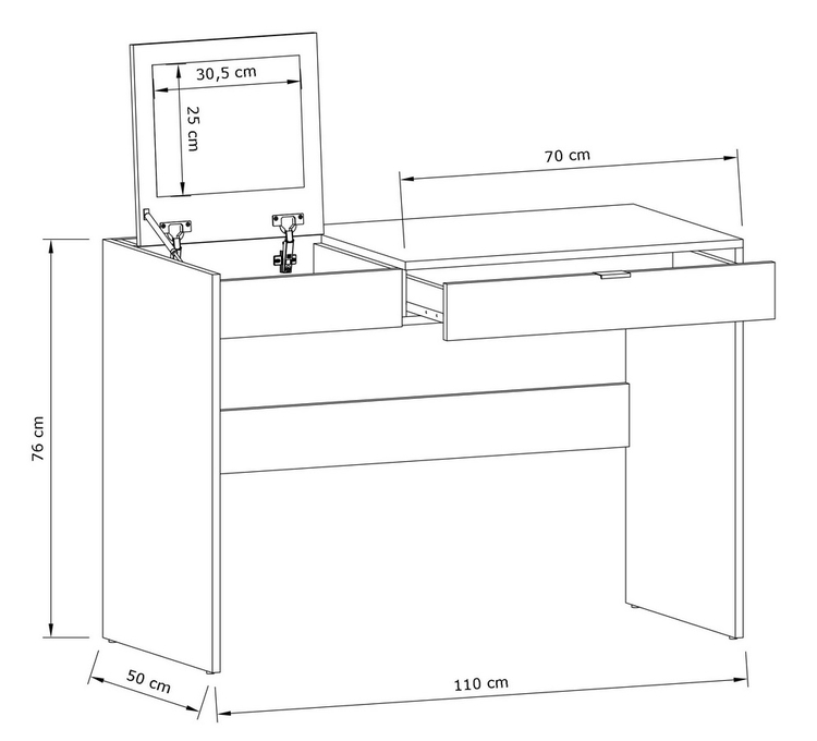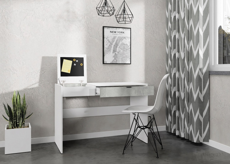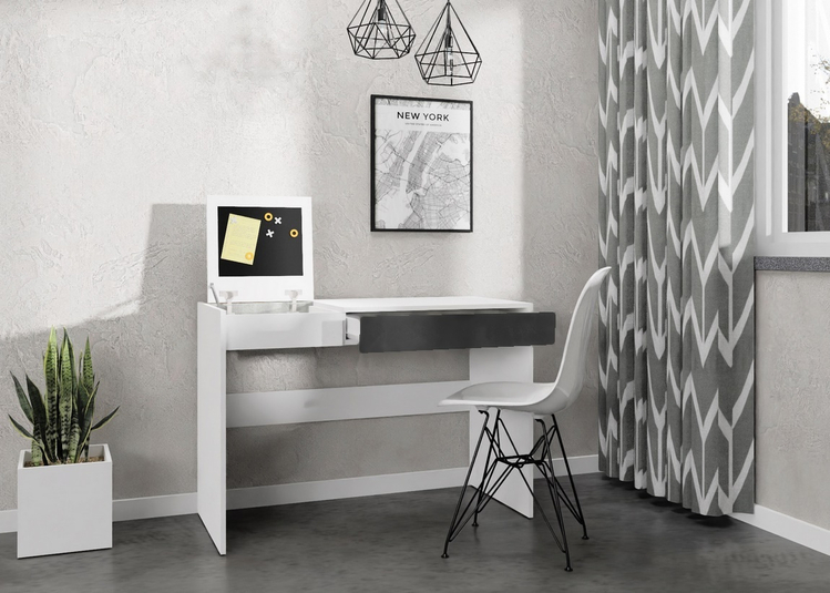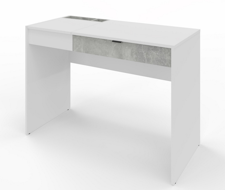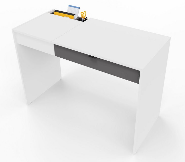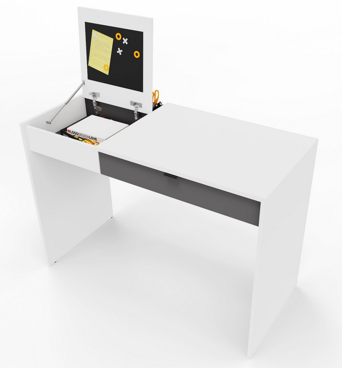 Skvělý pracovní stůl pro školáky! Stůl má klasický šuplík a druhý úložný prostor, kde po otevření získáte navíc i malou magnetickou tabuli. Dalším bonusem jsou pak zabudované 2 přihrádky pro drobnosti v rohu stolu. Ideální do malých dětských pokojů či pracoven. Barevné provedení – barva bílá mat s doplňky v barvě grafit. Dodáváme v demontovaném stavu.DOPRODEJ!CASA 57023