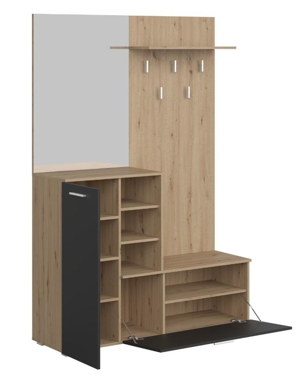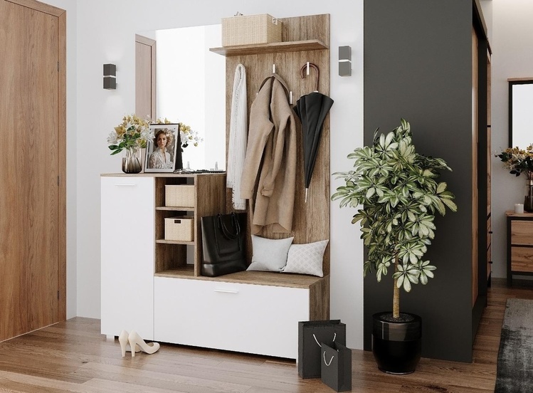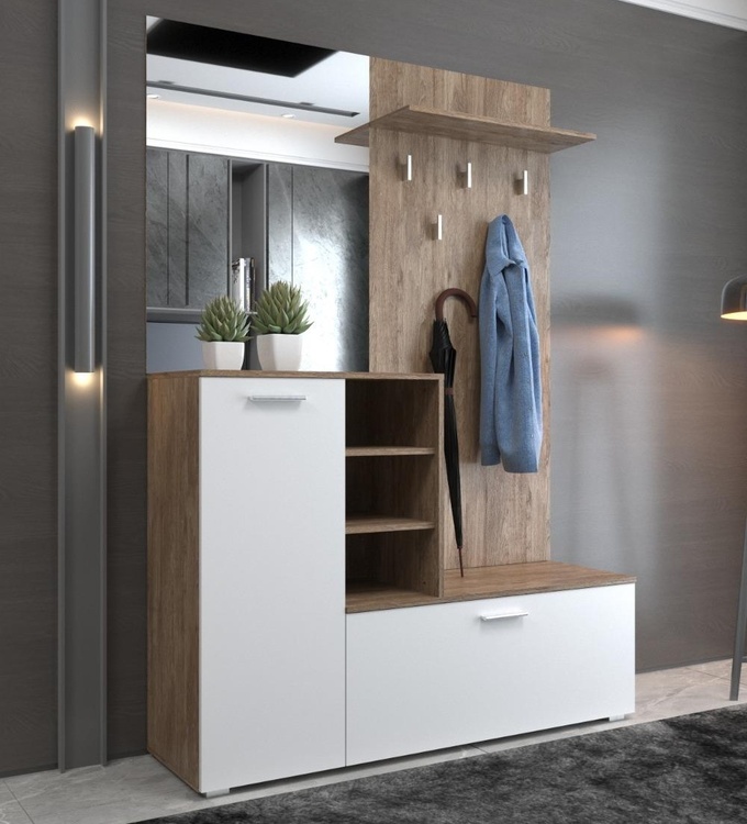 Předsíňová sestava poskytuje praktické a stylové řešení pro vaši předsíň. Barevné provedení je dub Ansberg tmavý/bílá mat. Sestava obsahuje – věšáky, odkládací police, skříňky na boty, zrcadlo, otevřené police. Materiál je kombinace LTD 22 a 16 mm. Je navržena tak, aby přinesla pořádek a styl do vašeho vstupního prostoru. Dodáváme v demontovaném stavu.CASA 94017
