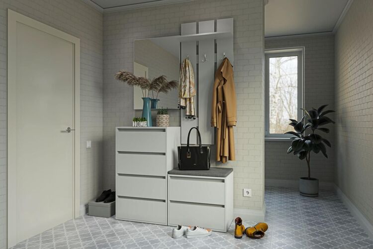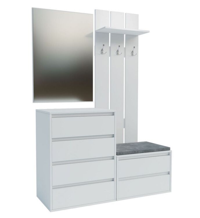 Předsíňová stěna vyrobená z kvalitní laminátové desky v barevném provedení bílá (NImfea alba). Sestava se skládá ( š/v/h ) – panel s věšákem ( 60 × 138 × 23,2 cm ),komoda se zásuvkami ( 60 × 80 × 42 cm ),botník se zásuvkami ( 60 × 40 × 42 cm ) a zrcadlo ( 60 × 85 cm). Další rozměry viz perokresba. Sedací polštářek je v ceně (barevné provedení polštářku se od obrázku může lišit). Dodáváme v demontovaném stavu.