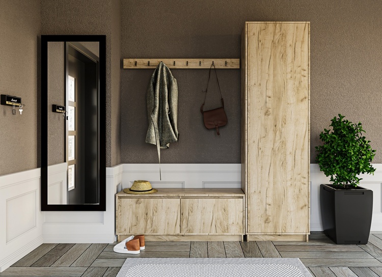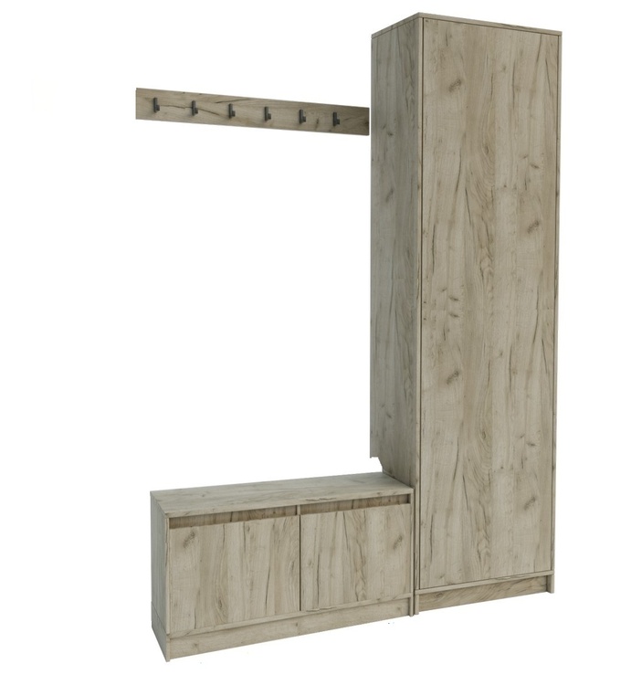 Moderní předsíňová sestava v minimalistickém provedení promění Vaši vstupní chodbu ve stylový a funkční prostor. Nabízí dostatek úložného místa a díky jednoduchým liniím působí moderně a vzdušně. Součástí předsíňové stěny je: Šatní skříň. nízký botník a věšákový panel. Rozměry viz obrázky. Další parametry a vlastnosti – materiál: LTD o tloušťce 16 mm, barevné provedení: dub kraft šedý. Rozměry: šířka 150 cm / výška 205 cm. Nabízíme i vetši rozměr i s jinou barvou. Dodáváme v demontovaném stavu.CASA 83176