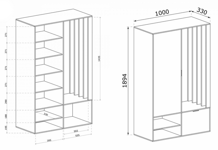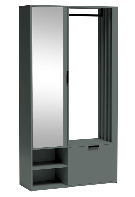 Moderní předsíňová stěna, vyrobená z kvalitní laminátové desky 16 mm v barvě green stone (šedá se zeleným nádechem). Boční strana předsíně je tvořena z lamel. Sestava se skládá z věšákového panelu, botníku a skříně se zrcadlem a volným prostorem. Rozměry viz obrázek. Předsíň je univerzální, dá se složit na obě strany. Dodáváme v demontovaném stavu.