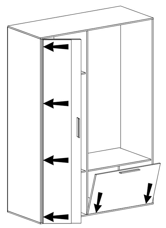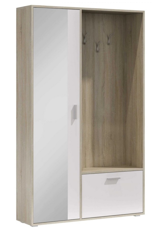 Moderní předsíňová stěna. Je vyrobená z kvalitní laminátové desky 16 mm. Korpus i dvířka jsou v barvě dub sonoma v kombinaci s alpskou bílou. Sestava se skládá z věšákového panelu, výklopného botníku a šatní skříně se zrcadlem ( uvnitř 2 police a šatní tyč ). Dodáváme v demontovaném stavu.CASA 71021