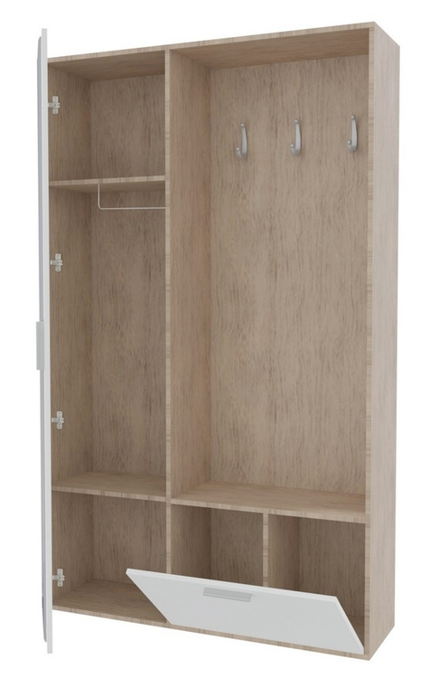 Moderní předsíňová stěna. Je vyrobená z kvalitní laminátové desky 16 mm. Korpus i dvířka jsou v barvě dub sonoma. Sestava se skládá z věšákového panelu, výklopného botníku a šatní skříně se zrcadlem ( uvnitř 2 police a šatní tyč ). Dodáváme v demontovaném stavu.CASA 71021