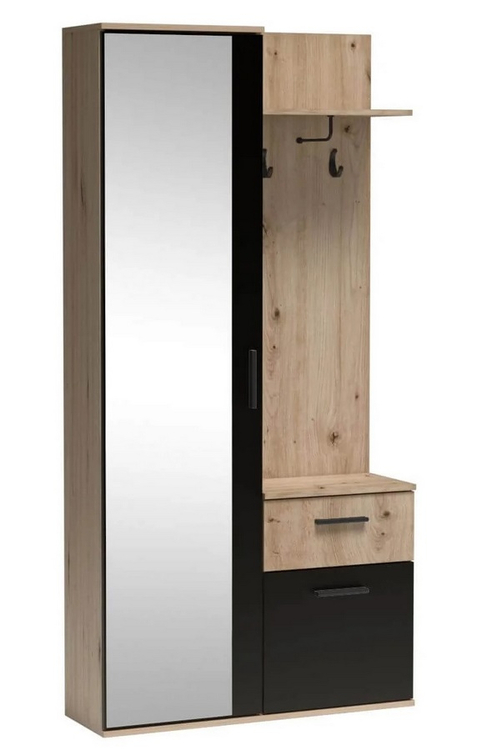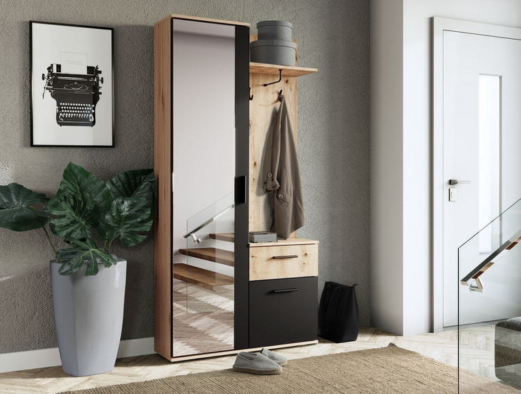 Moderní předsíňová stěna. Je vyrobená z kvalitní laminátové desky 16 mm. Korpus i dvířka jsou v barvě dub artisan v kombinaci s černou. Sestava se skládá z věšákového panelu s policí, botníku se zásuvkou a šatní skříně se zrcadlem. Dodáváme v demontovaném stavu.CASA 71011