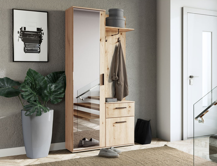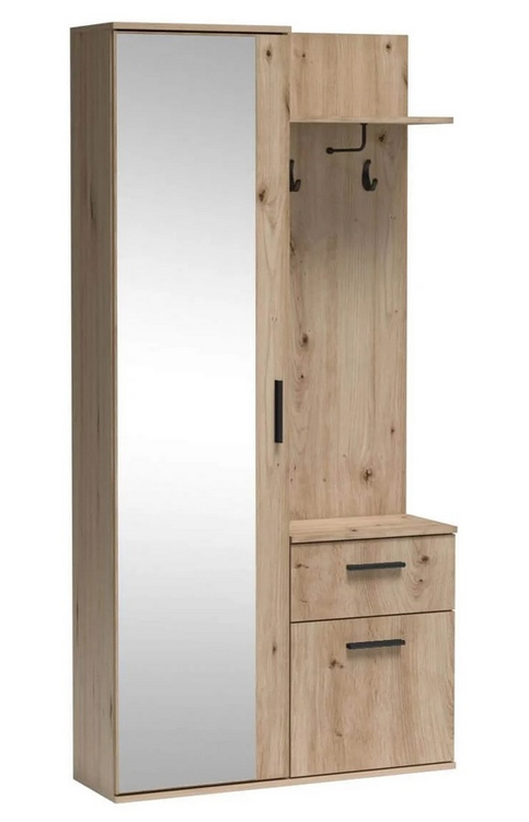 Moderní předsíňová stěna. Je vyrobená z kvalitní laminátové desky 16 mm. Korpus i dvířka jsou v barvě dub artisan. Sestava se skládá z věšákového panelu s policí, botníku se zásuvkou a šatní skříně se zrcadlem. Dodáváme v demontovaném stavu.CASA 71011