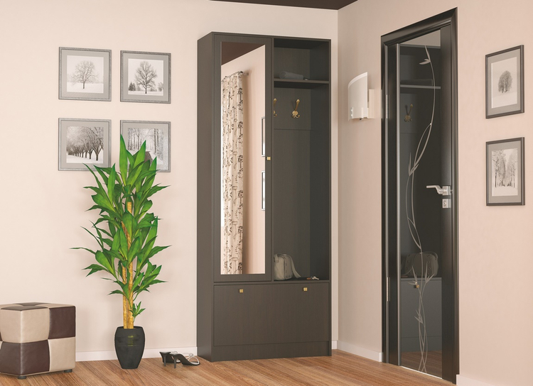 Moderní předsíňová stěna vhodná do menších prostorů. Stěna je vyrobena z kvalitní laminátové desky v barvě wenge tmavý. Součástí stěny jsou – skříňka na boty, vysoká skříň, dva věšáky na bundy, polička a na dveřích je zrcadlo. Dodáváme v demontovaném stavu.CASA 97008