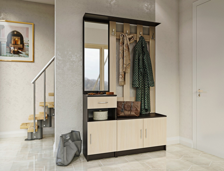 Předsíňová stěna je vytvořená v příjemných kontrastních barevných kombinacích. Vodorovné plochy jsou ve světlých odstínech, které opticky rozšiřují prostor. Je vyrobena z kvalitní laminátové desky v barvě dub mléčný, korpus je v barvě wenge. Sestava se skládá ( šxvxh ) – věšák ( 80 × 142 × 15 cm ),botník ( 80 × 55 × 38 cm ),nízká skříňka se zásuvkou ( 40 × 87 × 38 cm ) a zrcadlo ( 40 × 112 × 2 cm ). Dodáváme v demontovaném stavu.CASA 83084