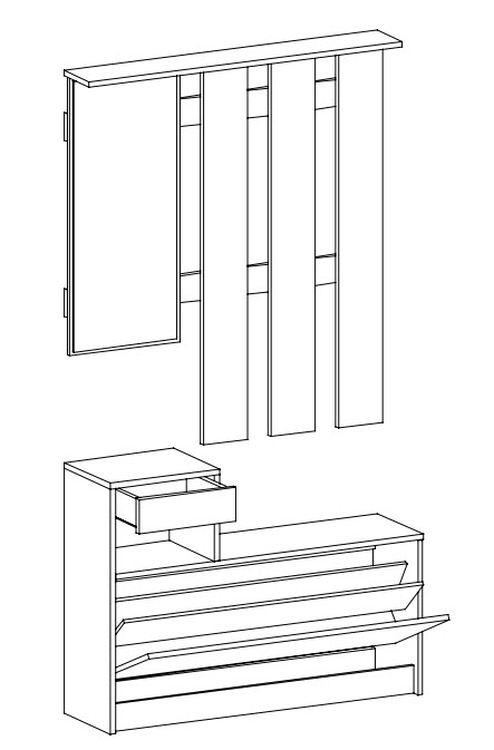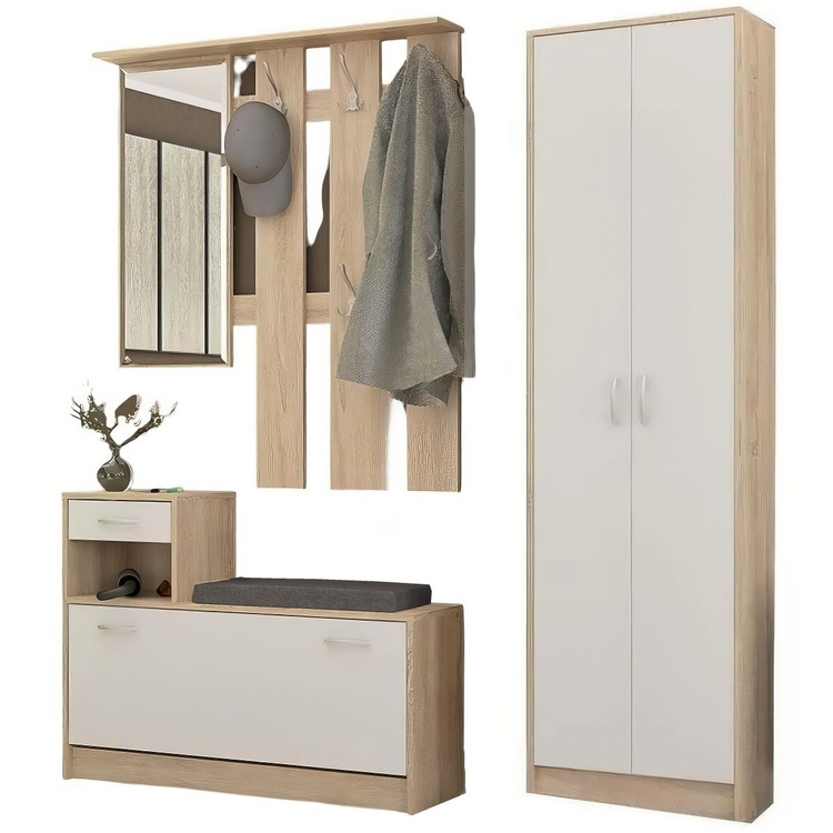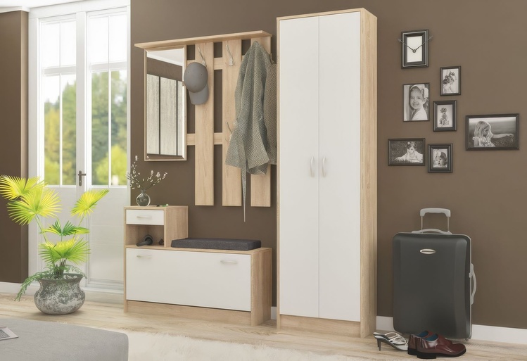 Moderní předsíňová stěna se zrcadlem a skříní. Stěna je vyrobena z kvalitní laminátové desky v barevné kombinaci dub sonoma/bílá mat. Součástí stěny je věšáková stěna se zrcadlem a poličkou a malý výklopný botník s policí a zásuvkou (100×187×27,5 cm),šatní skříň (55,3×191×27,5 cm) a... více informací o zboží
