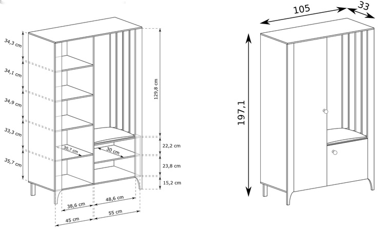 Díky šatní tyčí v jedné polovině a skříni vnitřními policemi