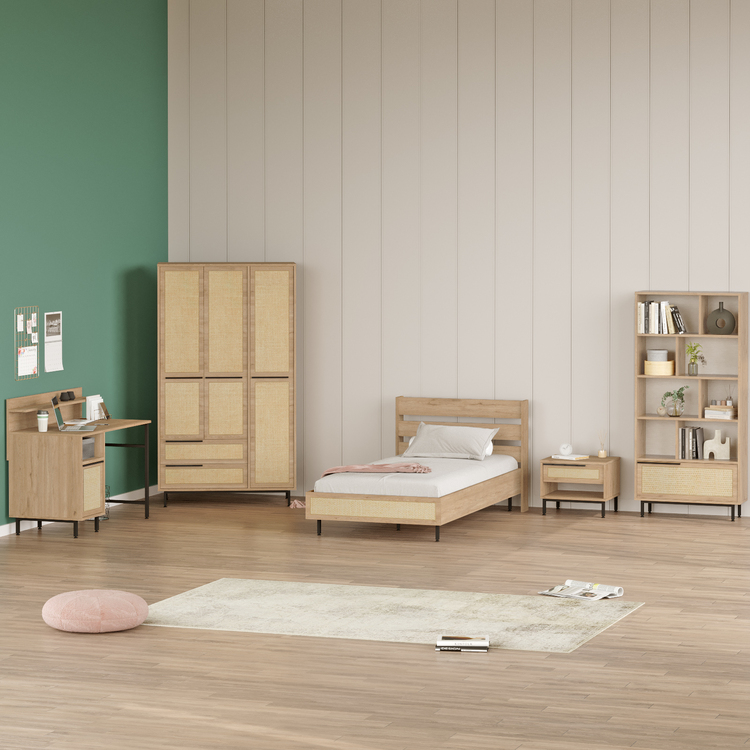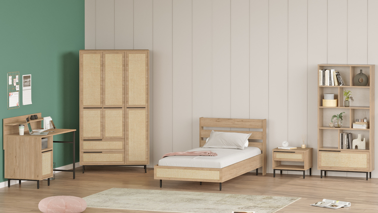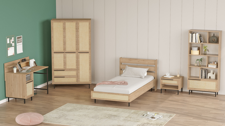 LONNY 24 kombinuje pohodlí a praktičnost. Postel poskytuje komfortní místo pro spánek, noční stolek je ideální pro lampičku nebo knihy, šatní skříň nabízí dostatek úložného prostoru pro oblečení a psací stůl zajišťuje ideální pracovní prostor pro studium nebo tvoření. Díky promyšlenému designu je tato sestava skvělým řešením pro organizovaný a stylový dětský pokoj.