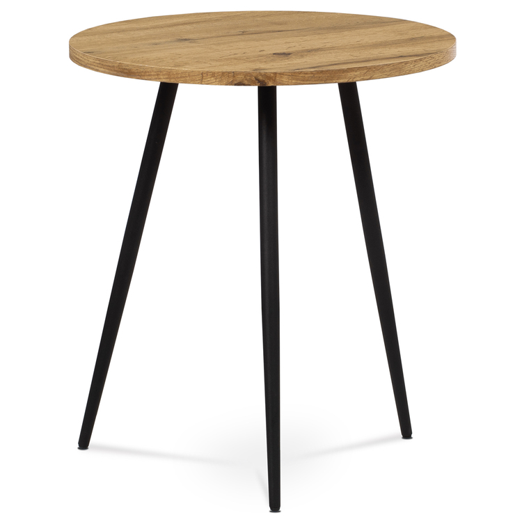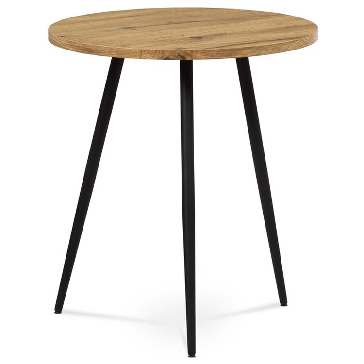 Přístavný stolek s deskou z MDF v dekoru divoký dub nabízí přírodní vzhled s výraznou strukturou dřeva, která podtrhuje jeho autentický charakter. Tělo stolku tvoří pevné kovové nohy s černým lakem, které zajišťují stabilitu a dlouhou životnost. Kulatý tvar desky a minimalistický design... více informací o zboží