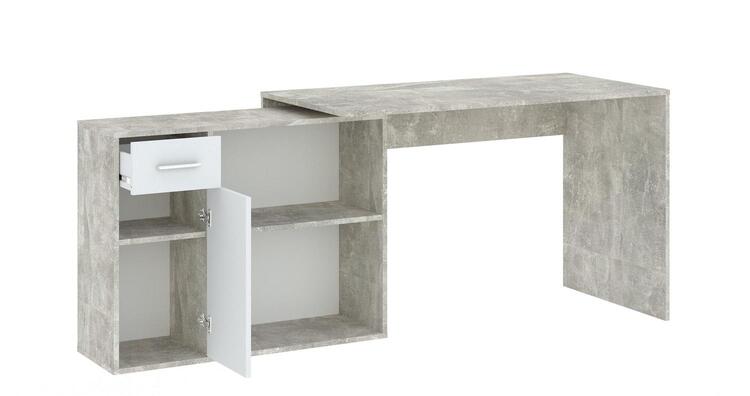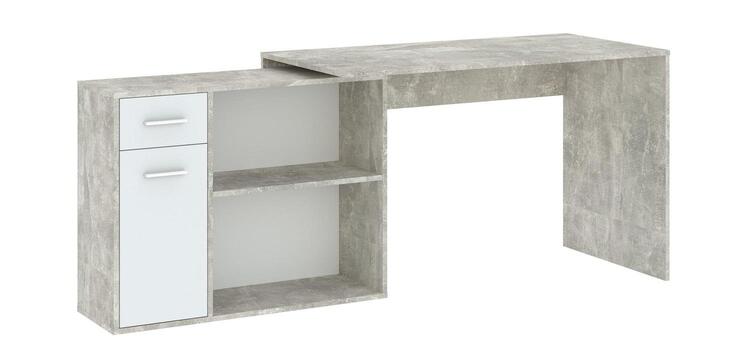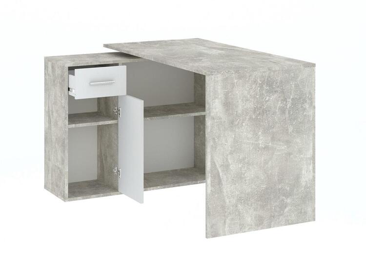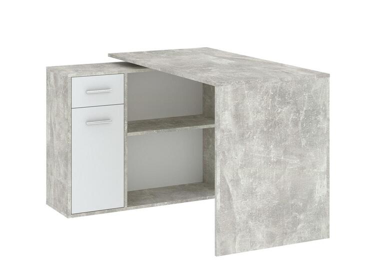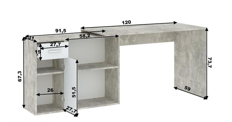 Psací stůl se spoustou úložného prostoru v moderním stylu, je vyroben z kvalitní LTD desky v barevném provedení beton/bílá. Výhodu tohoto stolu je jeho možnost sestavení rovně nebo do pravého úhlu. Úchyty jsou v barvě stříbrné. Dodáváme v demontovaném stavu.CASA 85033