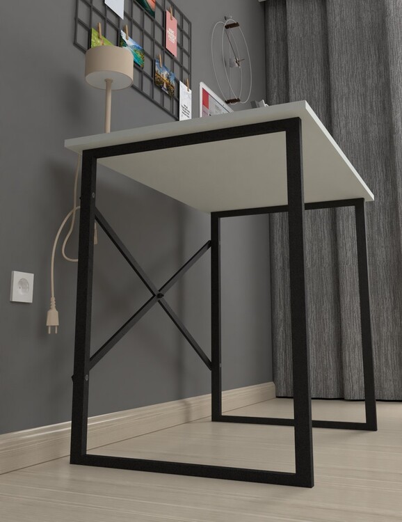 Stylový psací stůl je z kovového rámu v matné černé barvě a pracovní deska je vyrobena z kvalitní LTD desky. Barevné provedení pracovní desky je matná bílá. Dodáváme v demontovaném stavu.CASA 36012