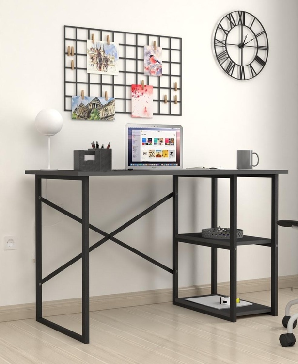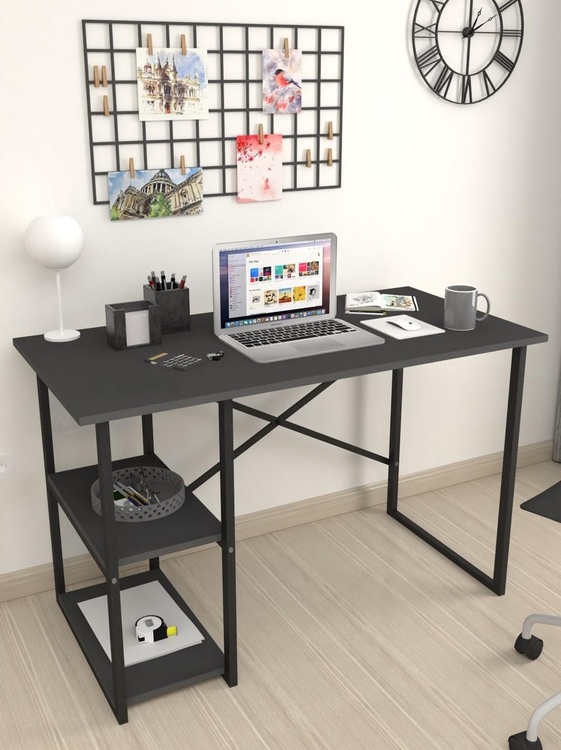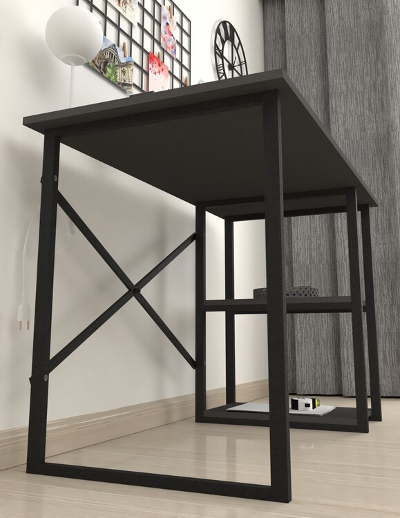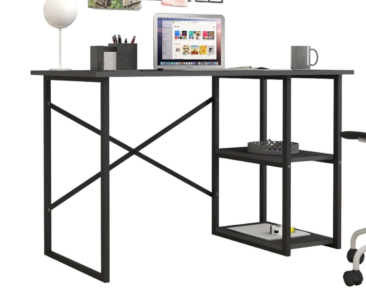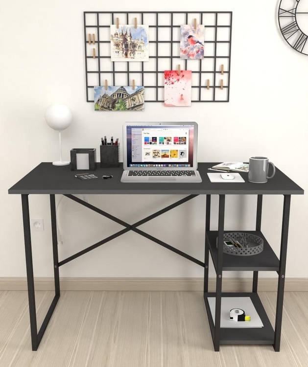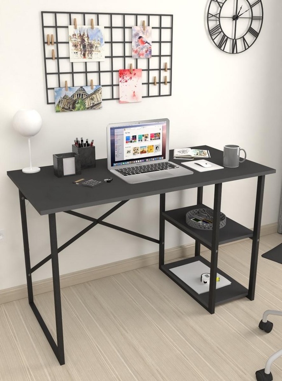 Stylový psací stůl je z kovového rámu v matné černé barvě, pracovní deska a dvě police jsou vyrobeny z kvalitní LTD desky v barvě antracit. Možnost dokoupení praktického nástavce.CASA 36013