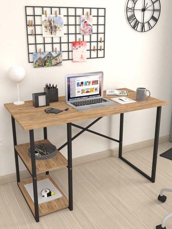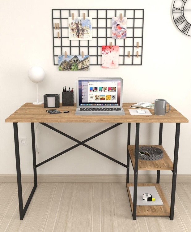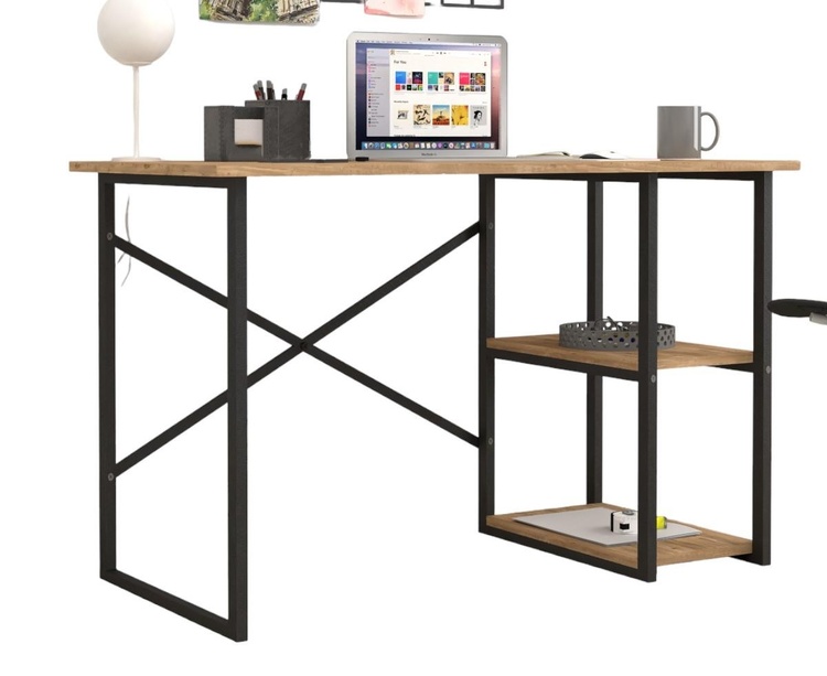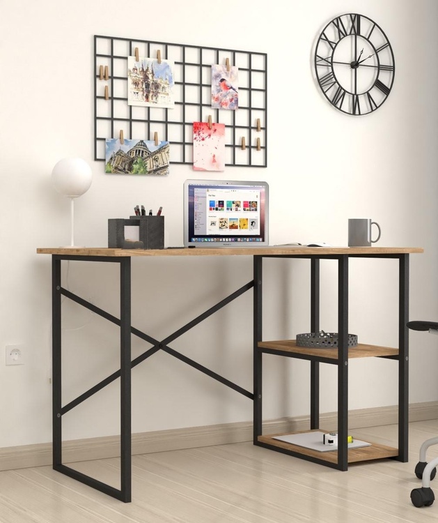 Stylový psací stůl je z kovového rámu v matné černé barvě, pracovní deska a dvě police jsou vyrobeny z kvalitní LTD desky. Barevné provedení pracovní desky a polic je borovice. Možnost dokoupení praktického nástavce. Dodáváme v demontovaném stavu.CASA 36013