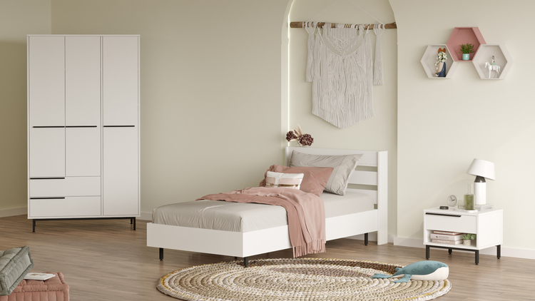 nabízí vše, co vaše dítě potřebuje. Jednolůžková postel poskytuje pohodlný prostor pro odpočinek, noční stolek je ideální pro knihy, lampičku nebo drobnosti, a prostorná šatní skříň zajistí dokonalou organizaci oblečení. Elegantní design a praktické uspořádání zajistí, že tato sestava zapadne do každého dětského pokoje.