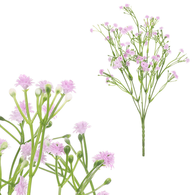 Představte si trvalou krásu květin, které vydrží v plném květu a nepotřebují žádnou péči. Naše dekorační umělé fialové gypsofily v kytici jsou dokonalou volbou pro ty, kteří si přejí mít, čit darovat svěžest a eleganci prostřednictvím květin, které nikdy neuvadnou. Vzhled kytice je díky svému provedení a důrazem na detaily s použitím kombinace plastu a textilu velmi realistický. Můžete si naplno a trvale vychutnávat krásu květin v jakémkoli ročním období. Díky širokému sortimentu různých dalších druhů umělé květeny v našem portfoliu se nabízí spousta možností, jak je kombinovat podle události, či vkusu a dekorativního stylu. S našimi umělými kyticemi získáte vy, či obdarovaný, trvalou květinovou výzdobu, která s sebou přináší nekončící radost a potěšení.