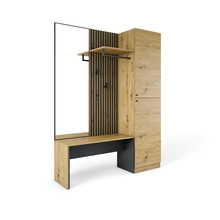 O stylový design Vaší vstupní části se postará moderní předsíňová sestava . Kombinace moderních barev jako dub Artisan v kombinaci s barvou antracit jí dodává jedinečný charakter. Designovým prvkem je zadní panel imitující trendové lamely. Za praktický rozměr sestavy jsou zodpovědné úložné prostory v podobě šatní skříně ve které se nacházejí 3 police. Snadný přístup ke kabátům zabezpečují věšáky, které jsou připevněny k zadnímu panelu panelu a také šatní tyč.