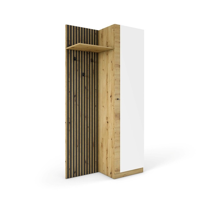O stylový design Vaší vstupní části se postará moderní předsíňová sestava . Kombinace moderních barev jako dub Artisan v kombinaci s barvou antracit jí dodává jedinečný charakter. Designovým prvkem je zadní panel imitující trendové lamely. Za praktický rozměr sestavy jsou zodpovědné úložné prostory v podobě šatní skříně ve které se nacházejí 3 police. Snadný přístup ke kabátům zabezpečují věšáky, které jsou připevněny k zadnímu panelu.