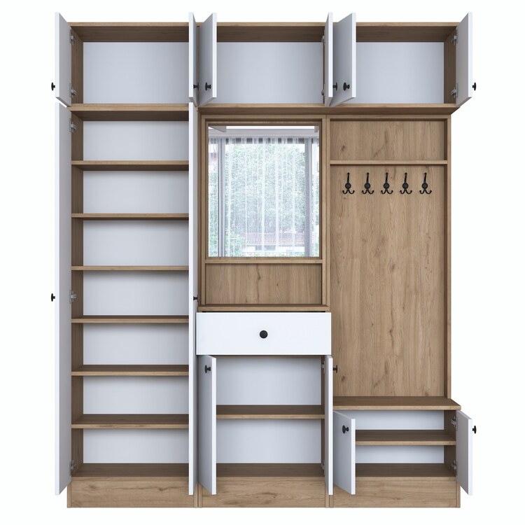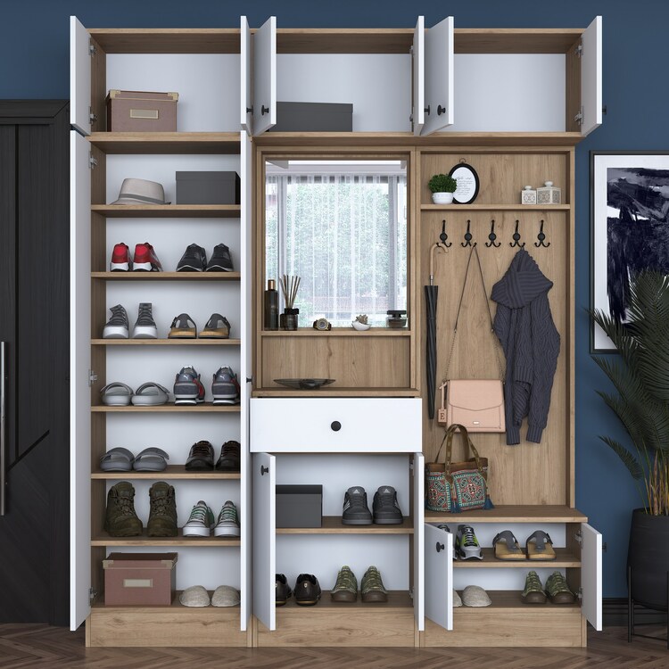 Předsíňová sestava přináší eleganci a praktičnost do každé domácnosti. Vysoký design v kombinaci bílé barvy a dekoru ořechu zajišťuje moderní vzhled a dostatek úložného prostoru, který vám pomůže udržet pořádek.