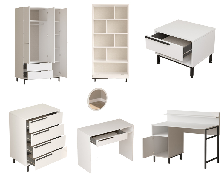 kombinuje pohodlí, praktičnost a styl. Postel nabízí komfortní místo pro spánek, noční stolek poskytuje prostor pro lampičku a knihy, šatní skříň zajistí dokonalou organizaci oblečení, psací stůl vytvoří ideální prostředí pro učení, knihovna nabídne prostor pro knihy a dekorace, a toaletní stolek dodává pokoji elegantní a praktický prvek pro osobní péči.